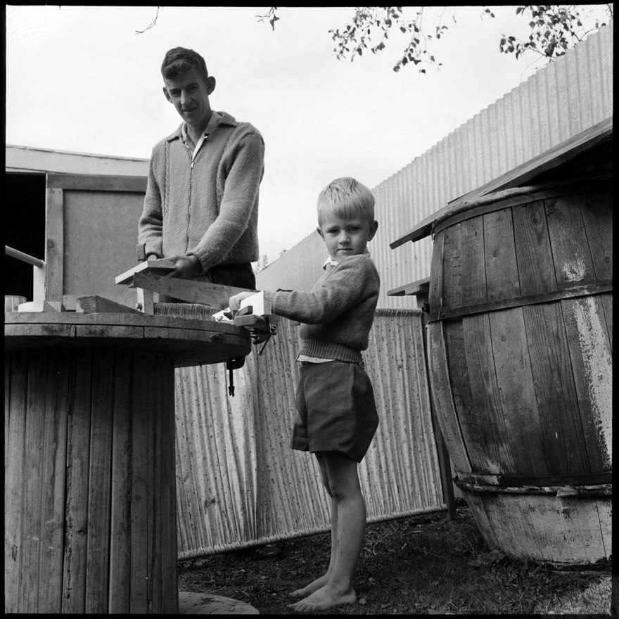 This image was taken for a story that ran in The Manawatu Evening Standard on 29 April 1963 "Saturday morning was a busy time at the Central Play Centre in the Y.W.C.A. lower hall. The centre has a roll number of 18 and there were 16 parents present. Everywhere there was a hive of industry with the children making free choice of play and activity while parents join in the fun and the supervisor moved around giving a kindly word of advice and encouragement. Above Mr. W. Lundy is repairing a screen while his son Mark is sawing a piece of wood for the boat which he is making."