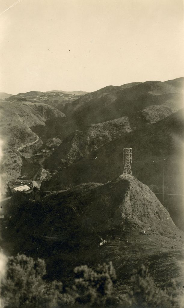 Faintly in this photograph can be seen the Mangahao - Khandallah 110 KV line. The Mangahao Power Station provides hydroelectric power and is situated near the town of Shannon. It serves Wellington, Horowhenua, Taranaki, Hawkes Bay, and the Wairarapa. After being delayed by the first world war construction began in late 1919 and the station opened in November 1924.
