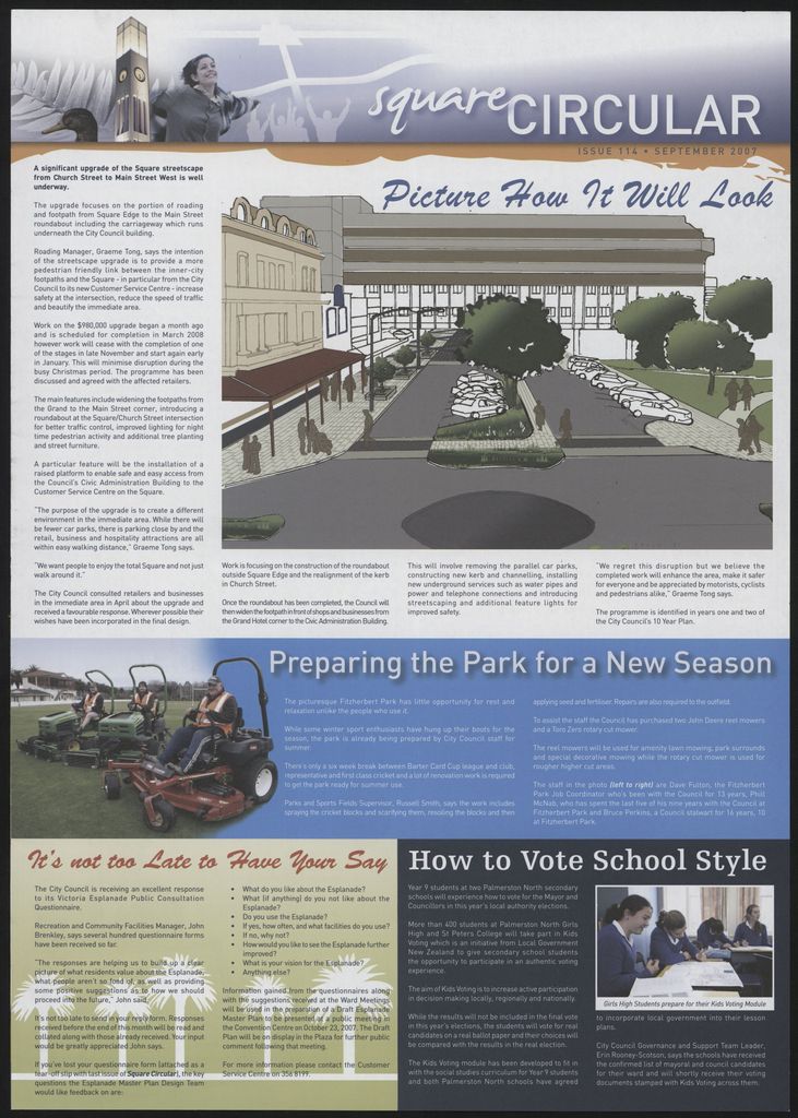 The Square Circular was Palmerston North City Council's monthly community publication, informing Palmerstonians of PNCC initiatives, activites, and events. This month's issue includes: Bodell Place, building consents, call centre, elements carnival, Craig Edney, District plan, dog control, election, environmental health officer, Fitzherbert Park, Hokowitu Domain playground, local initiatives fund, manholes, recycling centre, student city art week, the Square streetscape, Victoria Esplanade.