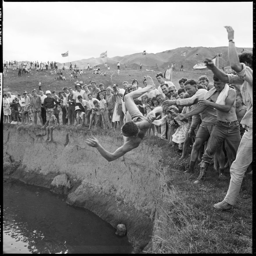 - [Image of motocross rider being thrown into a farm dam after the Guild Leaf international moto-cross series at Woodville yesterday.]