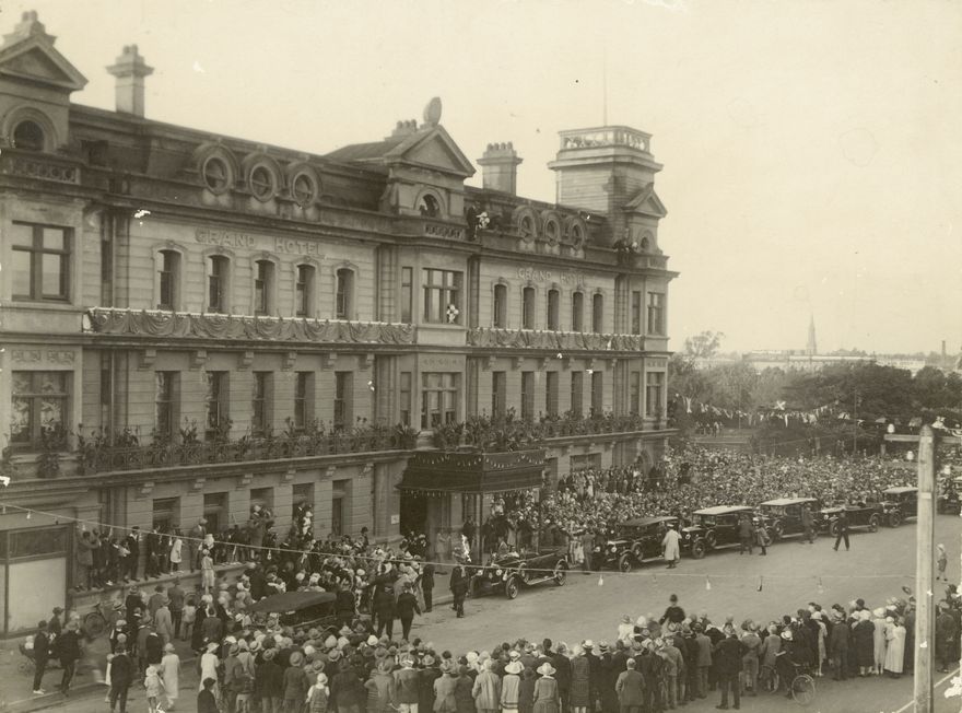 Crowds watch the arrival of the Duke and Duchess of York at the Grand Hotel in The Square, where they stayed overnight. The Duke and Duchess of York visited Palmerston North 3-4 March 1927, as part of their New Zealand tour. The Duke and Duchess of York became King George VI and Queen Elizabeth in 1936.