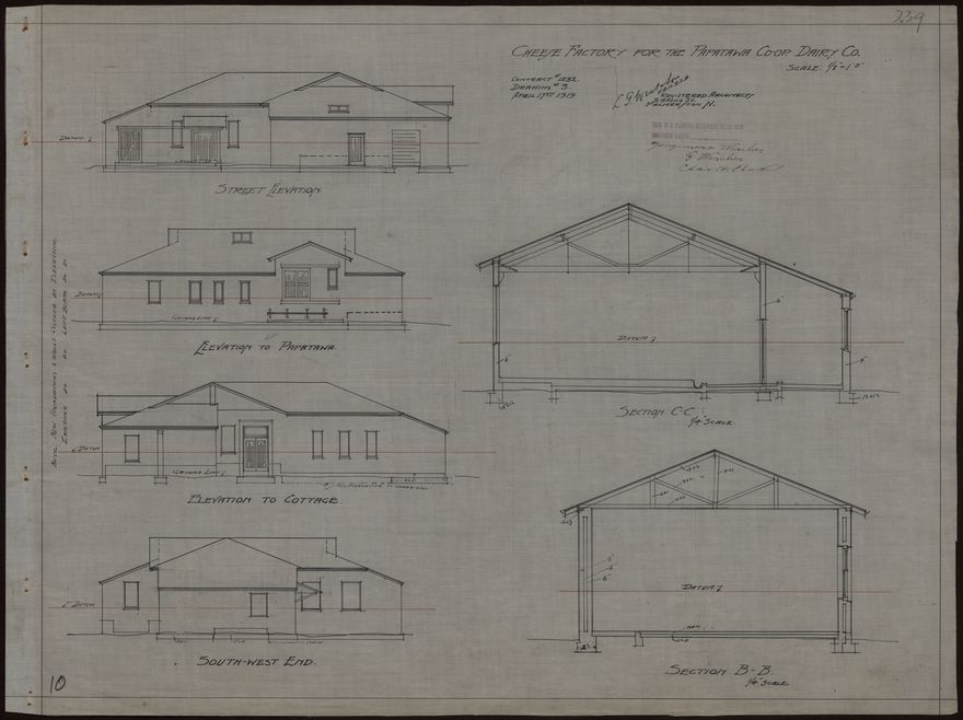 These plans for a cheese factory were designed by L. G. West and Son for the Papatawa Co-operative Dairy Company. The company, the first of the modern dairy co-operatives in the Woodville district, was established in 1912. The Danish-born architect Ludolph Georg West (1846-1919) established an architectural practice in Palmerston North in about 1880. In 1912 he formed a partnership with his son, Ernest Vilhem West, who continued the business after his father's death.