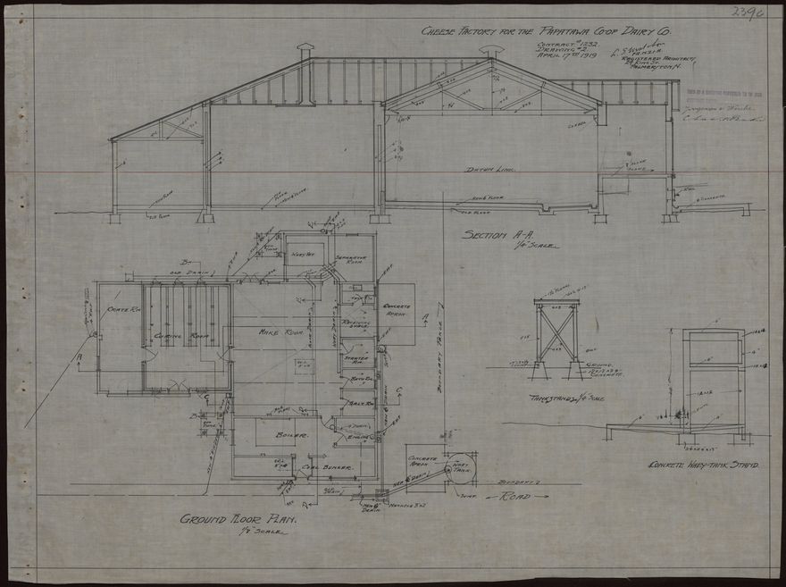 These plans for a cheese factory were designed by L. G. West and Son for the Papatawa Co-operative Dairy Company. The company, the first of the modern dairy co-operatives in the Woodville district, was established in 1912. The Danish-born architect Ludolph Georg West (1846-1919) established an architectural practice in Palmerston North in about 1880. In 1912 he formed a partnership with his son, Ernest Vilhem West, who continued the business after his father's death.