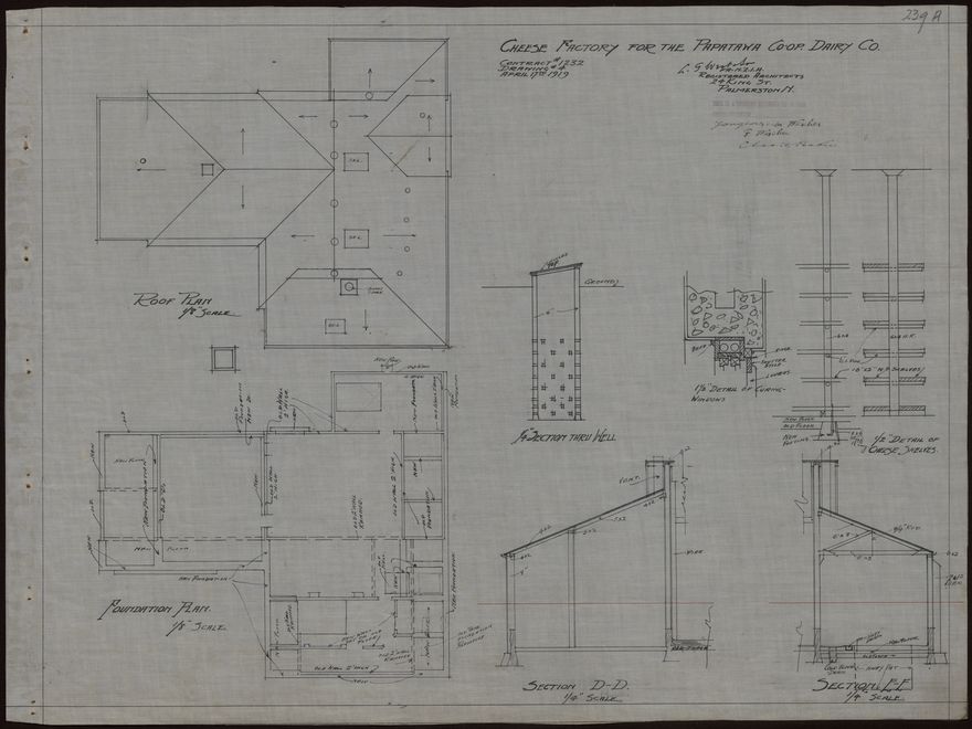 These plans for a cheese factory were designed by L. G. West and Son for the Papatawa Co-operative Dairy Company. The company, the first of the modern dairy co-operatives in the Woodville district, was established in 1912. The Danish-born architect Ludolph Georg West (1846-1919) established an architectural practice in Palmerston North in about 1880. In 1912 he formed a partnership with his son, Ernest Vilhem West, who continued the business after his father's death.