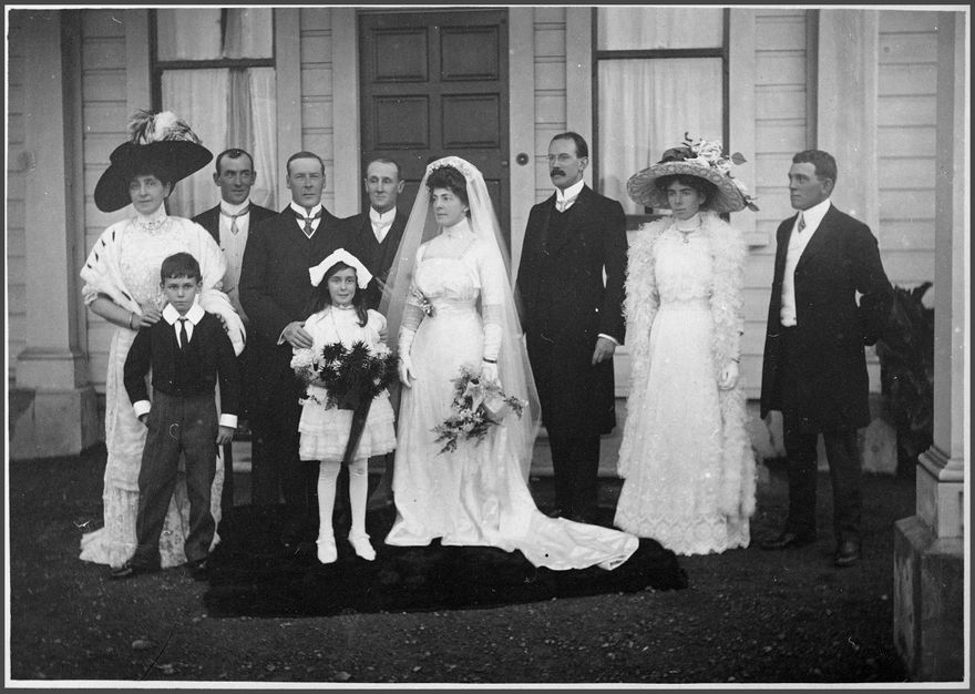 A family wedding at "Atawhai" (meaning warm welcome), the family home of the Keiller family. Back Row, from left: Janie Emereld Potts (formerly married to a Mr Waitt); Geoffrey Potts; H. H. Webb (Groom); Albert Keiller; Daisy Howley (bride); D. L. H. Belt (Best man); Sheila Hitchings; Valentine (Val) Hitchings. Front Row: Brian Keiller; Cecile Keiller.