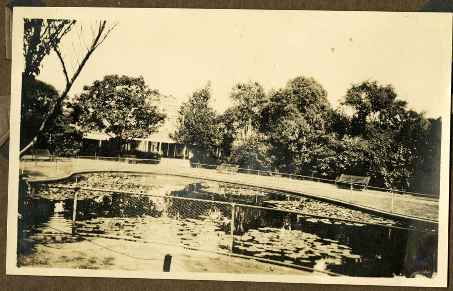 This photograph came from a small photograph album that belonged to Mrs R Andrews of Rangitikei House. This photograph bears the caption, "Water Lillies [sic] Square PN Jan 28." The body of water in the photograph is The Lakelet, also know as Butterfly Lake. Just visible behind The Lakelet is Leary's Pharmacy.