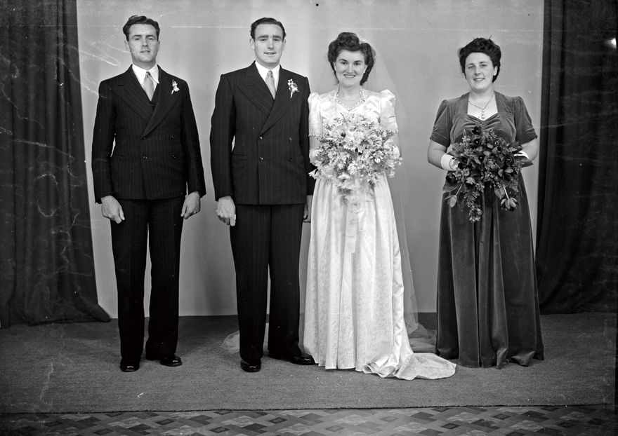 The Greening - Bennett Wedding. Mr and Mrs Joe Greening pose for a formal wedding photograph with their bridesmaid and best man.