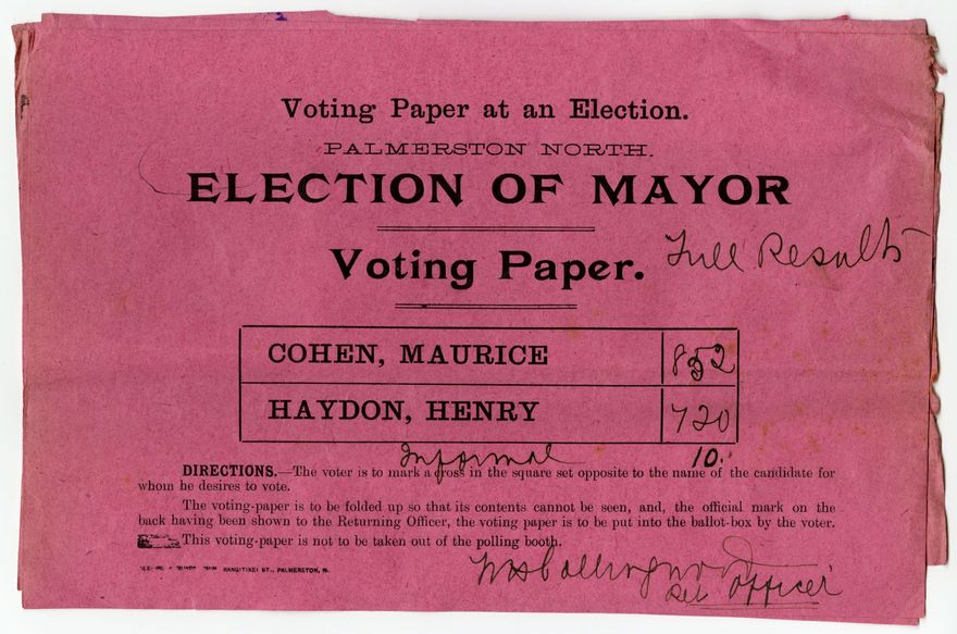 Voting paper, with full results handwritten in, for the 1905 mayoral election in Palmerston North, signed by M H Collingwood, Returning Officer. Also the official declaration of the results (carbon copy). the race was between Maurice Cohen and Henry Haydon. Cohen was elected Mayor and held office until 1907.