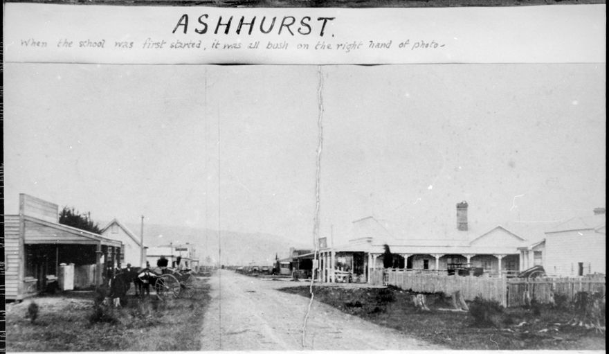 This photograph was taken in the vicinity of Duffy Chemist Shop. The second building on the left is Ashhurst School, the original portion of which was demolished in 1926. Note the tree stumps and narrow gravel road.