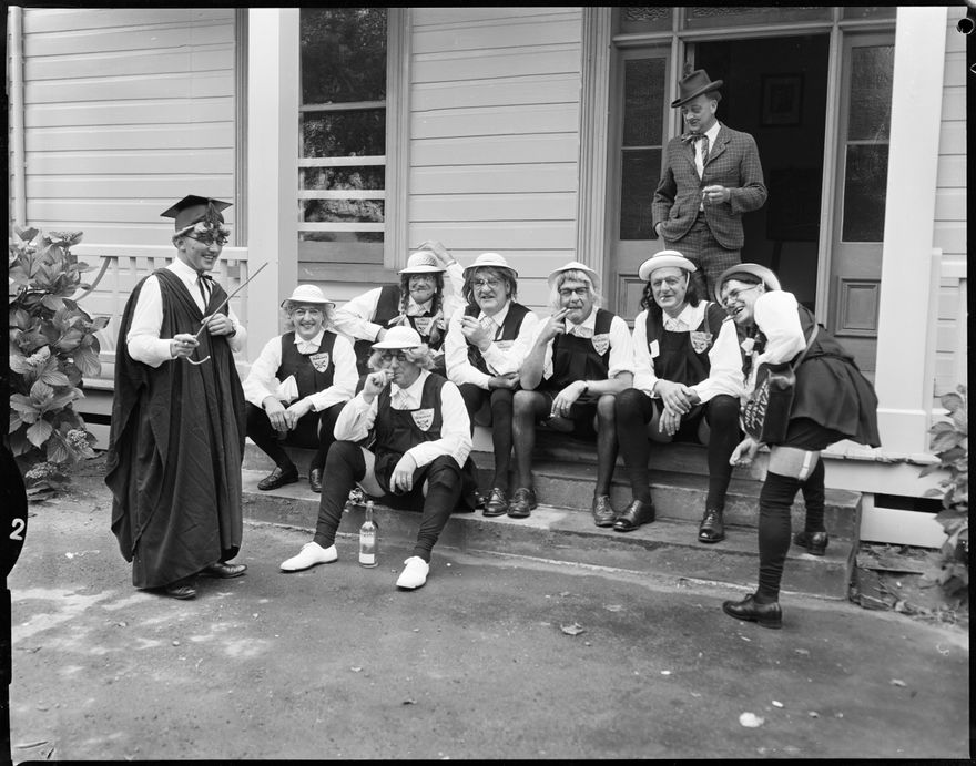 This image was taken for a story that ran in The Manawatu Evening Standard on 27 November, 1959. “The St. Trinians’ girls who assisted in the Commercial Travellers’ Association’s annual charity appeal today are seen on the steps of the Commercial Travellers’ Club as they receive their instructions from Miss Willowmena Bacon (left) before descending on the city to aid the appeal. “Flash Harry” makes a final inspection from the doorway.”