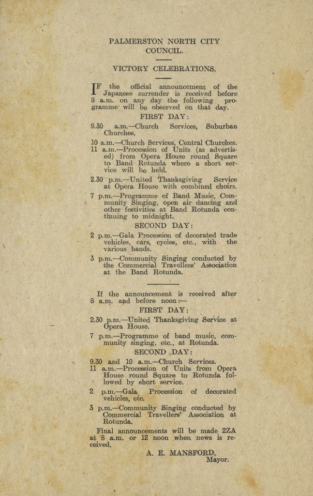 Palmerston North City Council programme of events to celebrate victory over Japan in WWII. Signed by A E Mansford, Mayor of Palmerston North. The programme was devised in the event of the surrender so no date is attached. The actual surrender took place 15 August 1945.