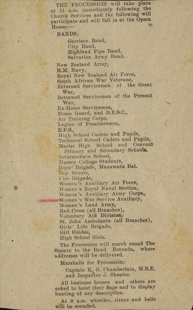 Palmerston North City Council programme of events to celebrate victory over Japan in WWII. Signed by A E Mansford, Mayor of Palmerston North. The programme was devised in the event of the surrender so no date is attached. The actual surrender took place 15 August 1945.
