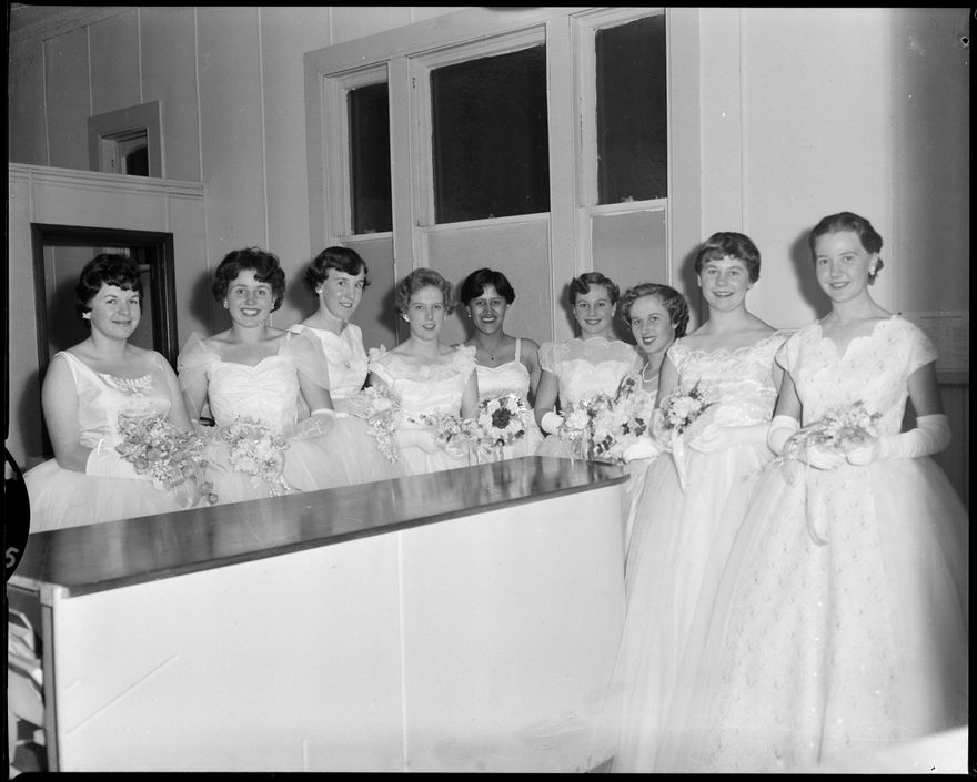 This image was taken for a story that ran in The Manawatu Evening Standard on 9 May, 1959. "Daintiness and dignity of the nine charming debutantes presented to the Leader of the National Party (Mr K. J. Holyoake) and Mrs Holyoake last evening at the annual National Party Ball held in the Astoria Ballroom. From left: Misses Peggy Tomasi, Barbara Poppe, Ngaire Poppe, Janne McCorkindale, Shirley Fitzerald, Gay Cowie, Constance Corlett, Janet Butt and Anne Blixt."" Other unpublished photos associated with this article taken on the same day, 2017N_2017-20_015177 and 2017N_2017-20_015178.