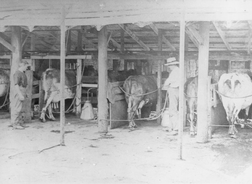 Milking cows at Arthur and William Gloyn’s milking shed. The farm was still operated by descendants of Mr L Gloyn in 1980.
