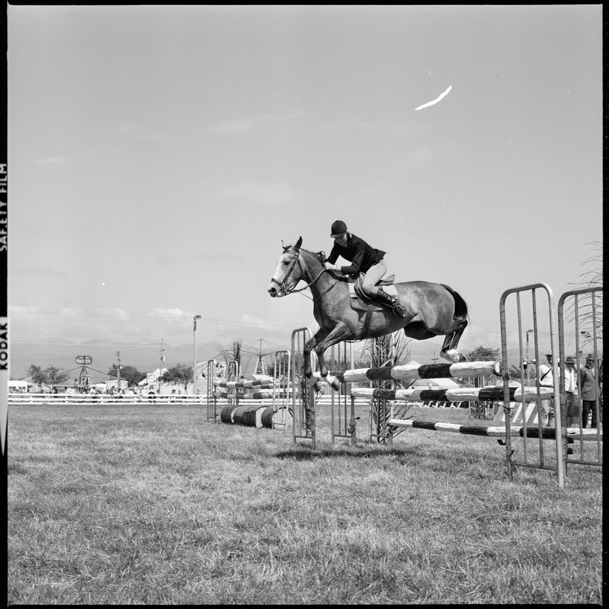 [Image of a horse jumping a fence, possibly at the Horowhenua A,. P. and I. Show.]