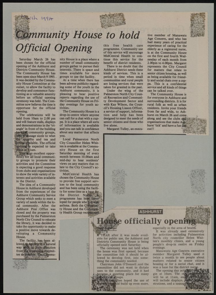 Community House in Ashhurst was initiated by the Ashhurst Community Service Group. It opened in 1993 in the former Post Office building, purchased by the PNCC as the new Ashhurst Library. The house part of the building was given over as a community space for community purposes. it opened 26 March 1993.