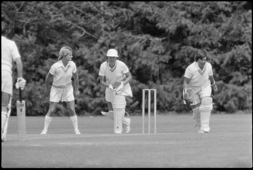 This image was taken (but not used) by the Evening Standard on 21st of January 1982. It depicts the New Zealand women’s cricket team taking on the International XI women’s team in a limited over match for the Hansell's Vita Fresh Women's World Cup 1981/1982. The match was held at Fitzherbert Park in Palmerston North. The New Zealand team won by 97 runs.