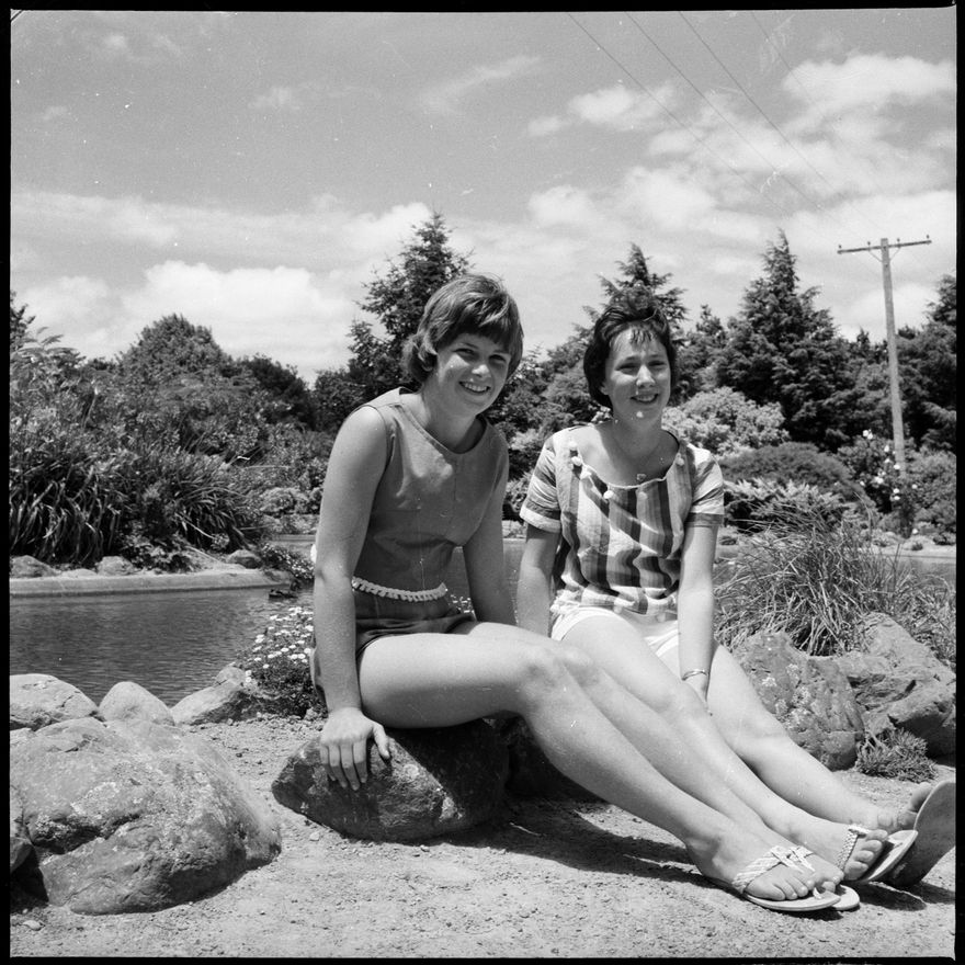 This image was taken for a story that ran in The Manawatu Evening Standard 5th January, 1963. "With beautiful sunny weather for the holidays, Miss L. Morpeth, of Palmerston North (left), took her friend from Whangarei, Miss K. Mulholland, to the small lagoon in the Esplanade to enjoy the beauties of Nature."