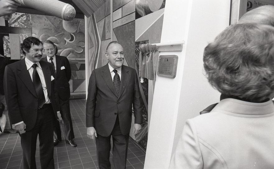This image was taken for a story that ran in The Manawatu Evening Standard on 15 November 1978 “Inflation No. 1 foe, Muldoon tells city”. Prime Minister Muldoon interrupted his election campaign to open the National Mutual Life Association centre, addressing an audience of 150 invited guests. Muldoon described the building as a “…handsome monument to progress.” In a speech delivered after the unveiling of a plaque, Muldoon stated that if re-elected the National government would fight against rising prices, warning that “…a continuation of inflation would destroy the economy.” He further urged people to view Superannuation as something for everyone, not just those aged 60 and over “…because young people know that, at the age of 60, they would have a basic minimum income.”