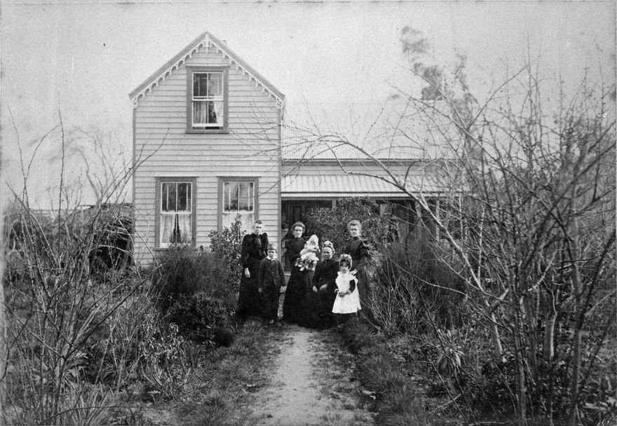 The house, constructed for Mr and Mrs Edwards Collins c1878, stood on Rangitikei Line opposite the Newbury School. It was later burnt down. The Collins property extended from the Kairanga-Bunnythorpe Road. It was said that the house had interesting cast-iron embellishments and that quality timber had been used for the doors, architraves and scotia. From left: Unknown; Unknown; Mrs J G Collins, holding eldest son Arthur; Mrs Edward Collins; Unknown; Edith Hill, granddaughter of Mrs. Edwards Collins.