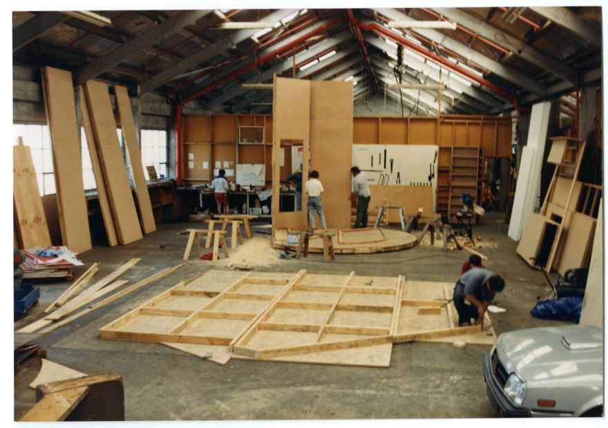 Stage crew from the Manawatu Theatre Society create sets for the Little Shop of Horrors. The show had two major set pieces which revolved to reveal different locations. This was the third (and final) location where sets were built after difficulties at the Shelley Street and Burke Street construction sheds.