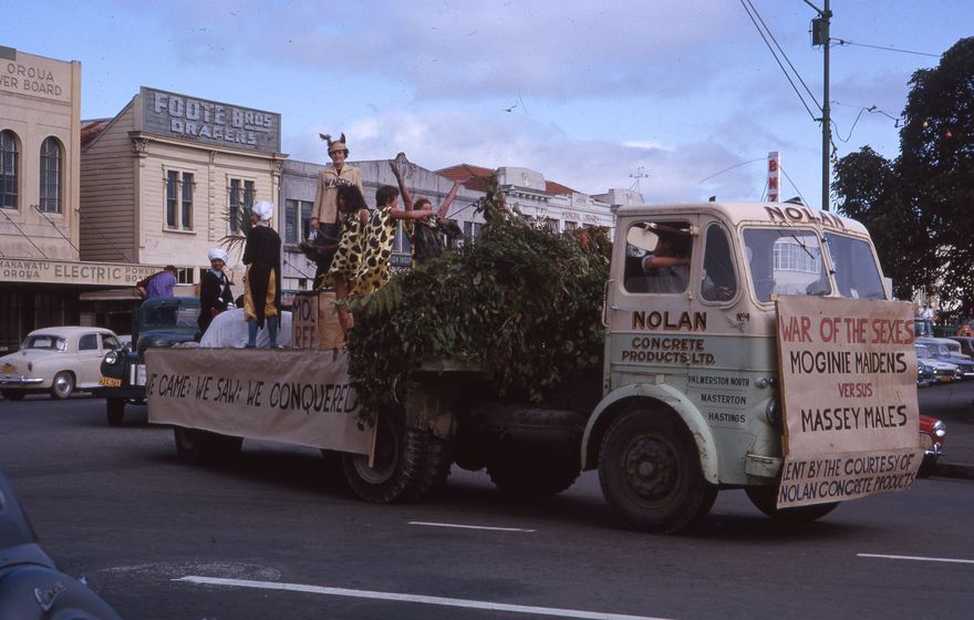 This float carries a sign decalring 'War of the sexes: Moginie Maidens versus Massey Males'. Moginie village/Mogine Hall was originally a women only on-campus accommodation block at Massey University.
