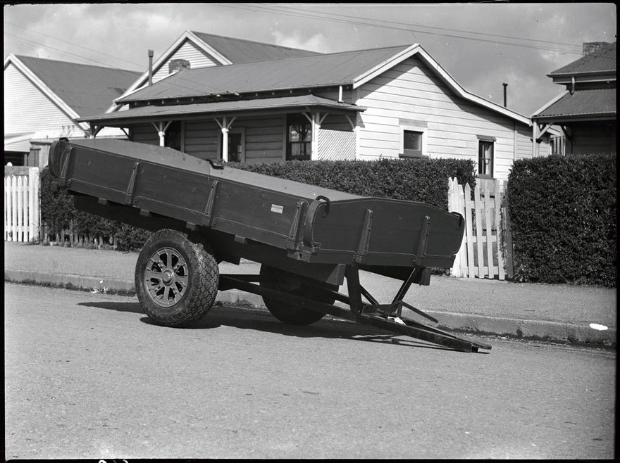 A Reid and Gray wooden trailer pictured in a residential street of Palmerston North. Reid and Gray made agricultural implements and had branches throughout New Zealand.