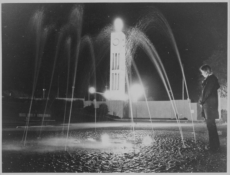This photograph comes from an article in the Manawatu Evening Standard (16 September 1972) regarding the contributions made by the local combined Lions Clubs to the Centenary Square Project. Along with other public works, a lit fountain was built to create a night time space for The Square. Darkened by the overhanging trees, the area was anecdotally known as a dangerous place to be after dark. It was removed in the mid-2000s as part of an initiative to make The Square safer. The original caption read, "The area is also a night-time place. The tranquil atmosphere of the surroundings are emphasised in a thoughtful girl beside the fountain. Lights at the basement of the water jets reflect a thousand droplets as they splash towards the cobblestone fountain base. In the background, the lighted cross on top of the clock tower pierces the night."