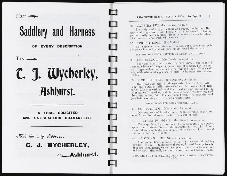A reproduction of Our Own Cookery Book compiled by Mrs J. West for the Ashhurst Town Band Bazaar. The cook book features community submitted recipes (including the names of contributors) and includes many advertisements of local area businesses.