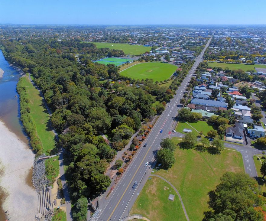 Image of part of Palmerston North, running down Fitzherbert Avenue to the Manawatu River. To the left in the foreground, can be see the bushed area of the Victoria Esplanade, with Fitzherbert, Manawaroa and Ongley Parks beyond. Directly behind Fitzherbert Park is Palmerston North Girls High School. On the right is the approach to river and the beginnings of the Hokowhitu suburb. Photographed from a drone, flown by Robert McLellan.