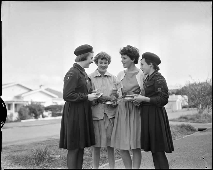 This image was taken for a story that ran in The Manawatu Evening Standard on 20 August 1960 "Four young girls with a single purpose today were Suzanne Smith (left), Ianthe Watford, Cheryl Graves and Rozea Stevens. Two hundred helpers in 53 cars were out early canvassing for the sale of health stamps in the city area. It is expected that sales this year will exceed those of last year. Girl Guides, Boy Scouts and the Boys' and Girls' Life Brigades assisted with the selling of the stamps."
