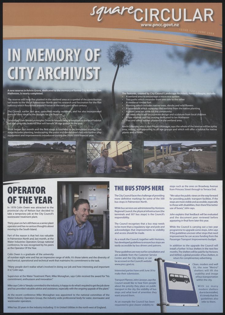 The Square Circular was Palmerston North City Council's monthly community publication, informing Palmerstonians of PNCC initiatives, activites, and events. This month's issue includes: Matheson Reserve, Colin Owen at the wastewater treatment plant, bus stops, Lee Odlin at Central Environmental Laboratories, cemeteries, gas heaters, food safety legislation, Pit Park, workplace safety award, dog registration, Kahuterawa Outdoor Recreation Plan, the Lido, tourism and visitors, The Stomach, Square Edge.
