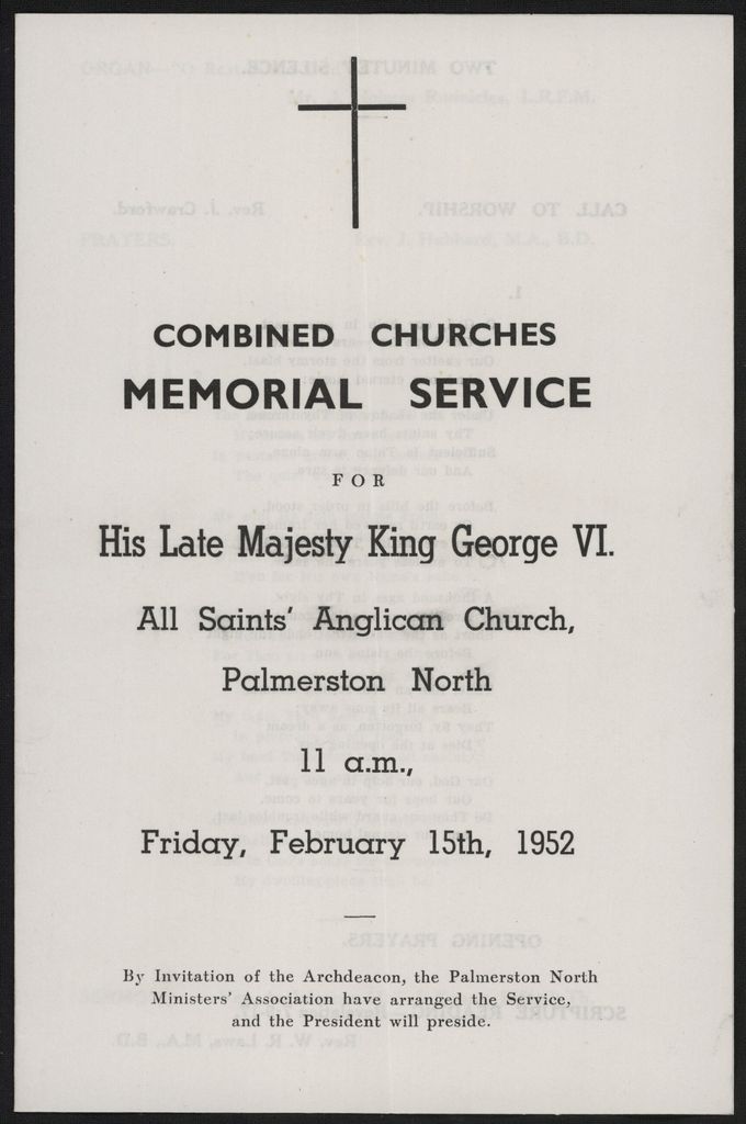 The order of service from the combine church memorial service for King George VI, held at All Saints' Church.