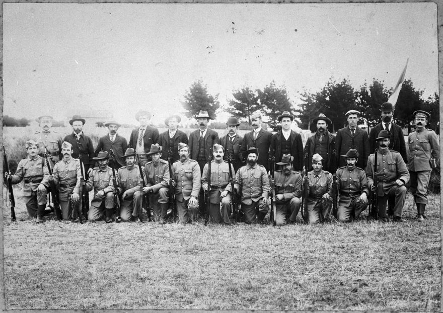 This photograph was taken on Empire Day in 1902. It shows the Foxton Militia vs the Shannon Riflemen (who are in mufti because their uniforms could not be distinguished from the Foxton group, as they were all volunteers). They are thought to be participating in a shooting competition. Identified are: George Stevenson of Shannon, 2nd from left back row; William Davey (son of Sam Davey, Kairanga farmer)), 3rd from left back row; William Shearman of Shannon, 6th from left back row; ? Nye (cousin of William Shearman), 3rd from left front row.
