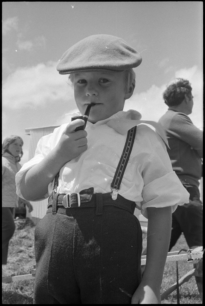 "Looking like a pioneer of old, Craig Hills, 6. Sanson. Puffs quietly on his pipe as he watches the procession."