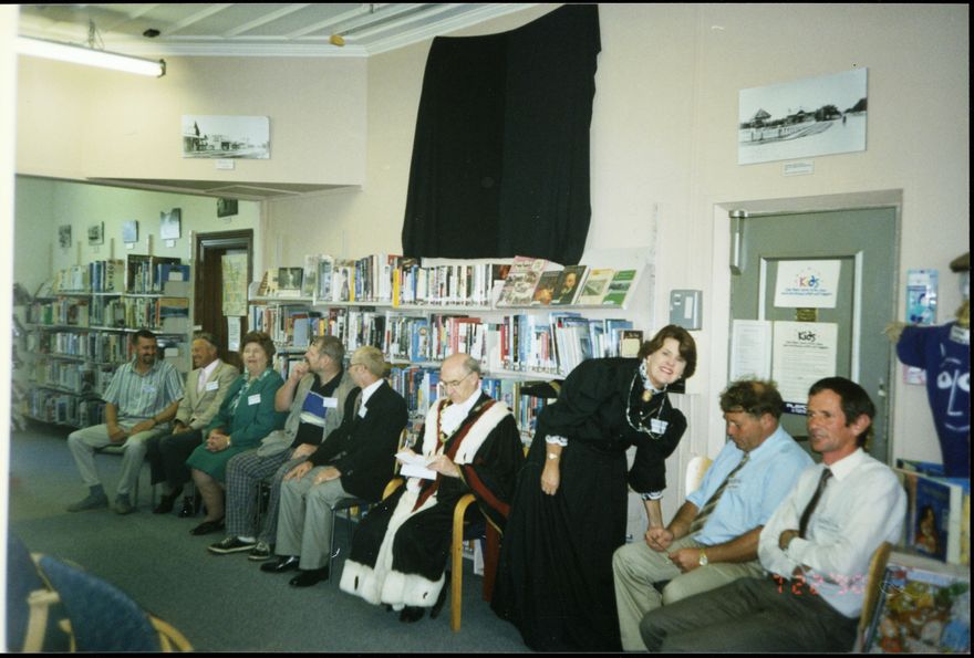 On the occasion of the Ashhurst (former) Post Office building's centenary. The building is now used at the town library. In this photograph dignataries are seated in the library. Mayor of Palmerston North, Paul Rieger, wears his mayoral robes, with Mary Rae Bowling, Ashhurst librarian, is standing to his right.