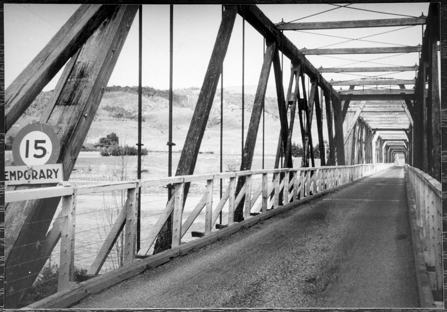 The second bridge, spanning the Manawatū River near Ashhurst, was officially opened on 9 June 1909, replacing a previous bridge that was swept away in the flood of 1895. The bridge was replaced by a concrete structure in 1969. This photograph is believed to have been taken shortly before the bridge was demolished.
