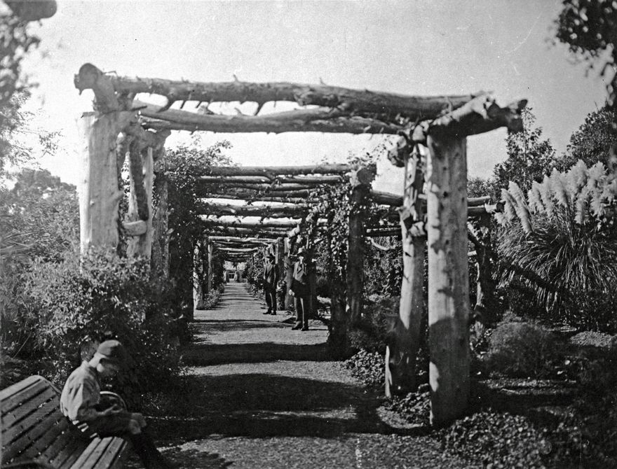 Shown here are people enjoying the Pergola built in The Esplanade – the Palmerston North City gardens. Development began on the Victoria Esplanade in Palmerston North, named to mark Queen Victoria's 60th jubilee, in 1897. The pergola was built c1916-1917 and demolished c1940.