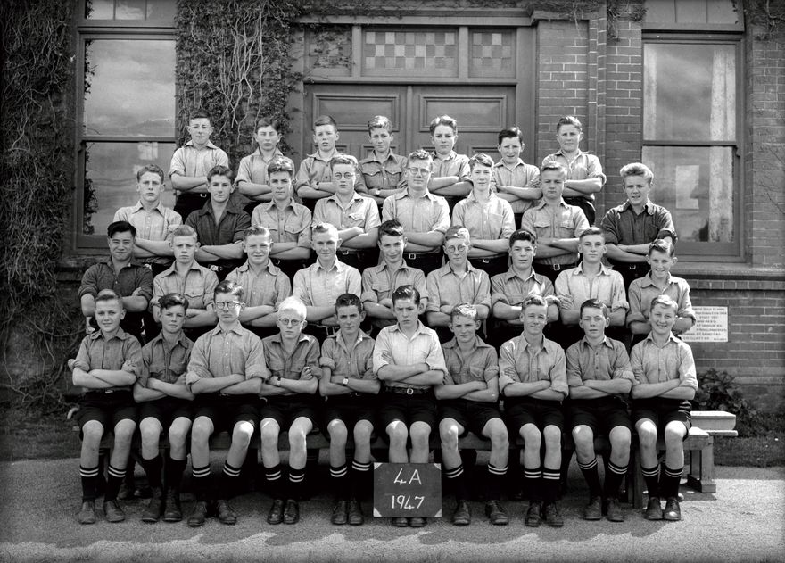 The 4A class of 1947 group pose for their photograph. According to the school year book for 1947, the boys in this form are: R Aiken, N Anderson, D Ansell, M Bright, D Brown, J Carr, P Coster, F Coulter, W Currie, T De Cleene, C Dixon, W Farquhar, C Gilbertson, I Graham, C Harrison, G Hubbard, G Jensen, I Jensen, R Justice, B Kerr, T King, R McCulloch, M McDowall, P Moodie, D Mummery, R Nelson, K Ogier, K Pallesen, G Petersen, R Seeker, D Seymour, D Snell, C Spark, D Waugh, B White, G Yourtt, J Young. Some boys may be absent from this photograph.