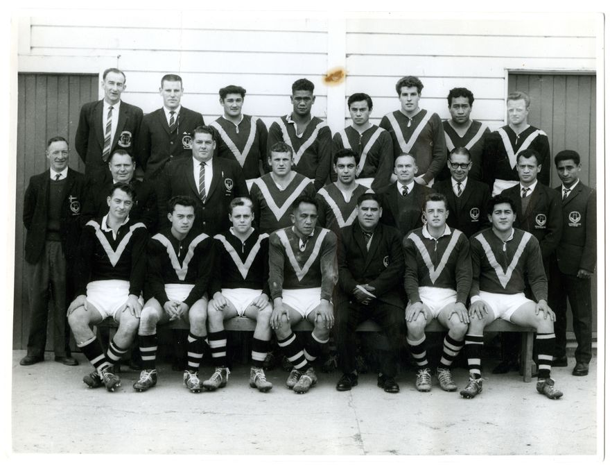 The Manawatū Rugby League representive team, circa 1964-1966. Top Row: Barry Robinson, unidentified, unidentified, Darkie Eru, Willie Far, unidentified, unidentified, unidentified; Middle Row: unidentified, unidentified, unidentified, Ron Gosling, Duda Thompson, Cliff Bradley, Bert Shortman, Fred Hohepa, Orai Rewi; Front Row: Barry Robinson, Quin Far, unidentified, Tom Woon, Norm Berryman, unidentified, Bob Simmons.