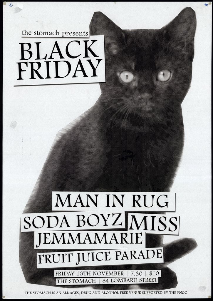 Black cat. the stomach presents Black Friday. Man in Rug. Soda Boyz. Miss. Jemmamarie. Fruit Juice Parade. Friday 13th November. 7.30. $10. The Stomach 84 Lombard Street. The Stomach is an all ages, drug and alcohol free venue supported by PNCC. Part of a collection of posters that were displayed at The Stomach, Lombard Street, venue for Creative Sounds Society Incorporated.