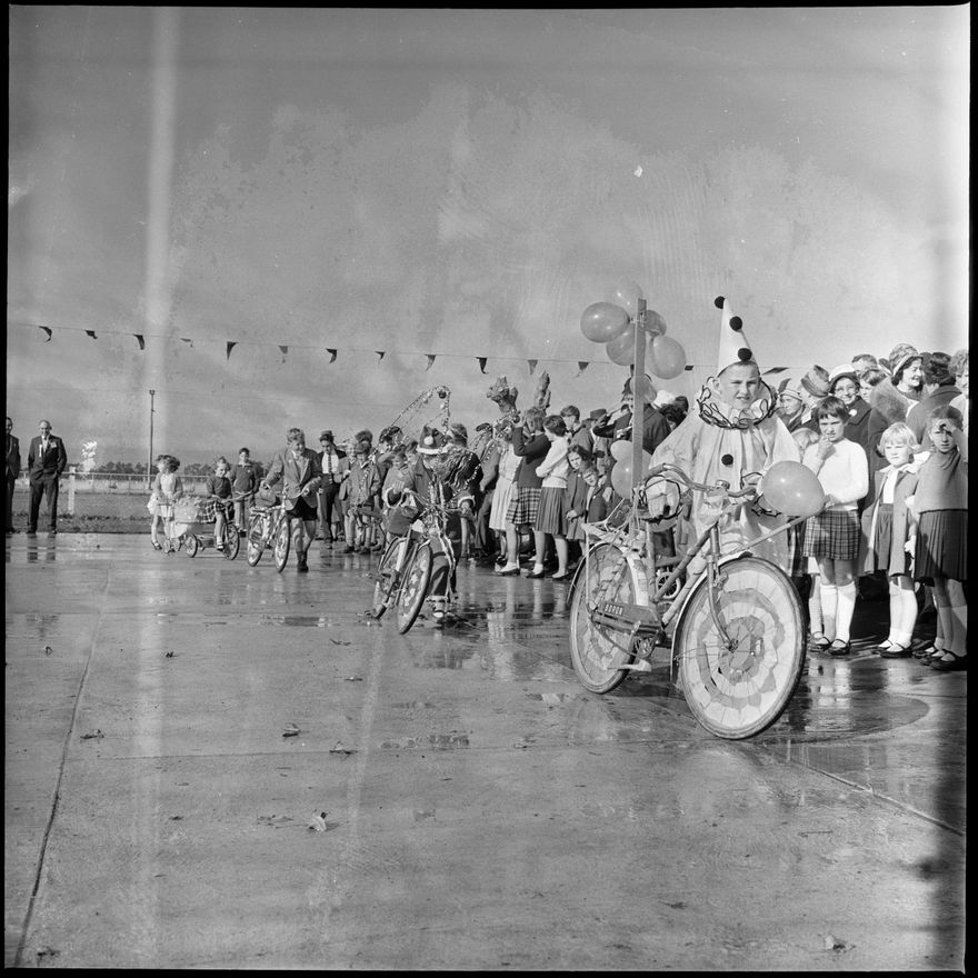 - [A large group of people watch as children parade in front with their bicycles. The bikes are decorated, the boy in front wearing a clown costume. There are balloons and bunting decorating the area.]
