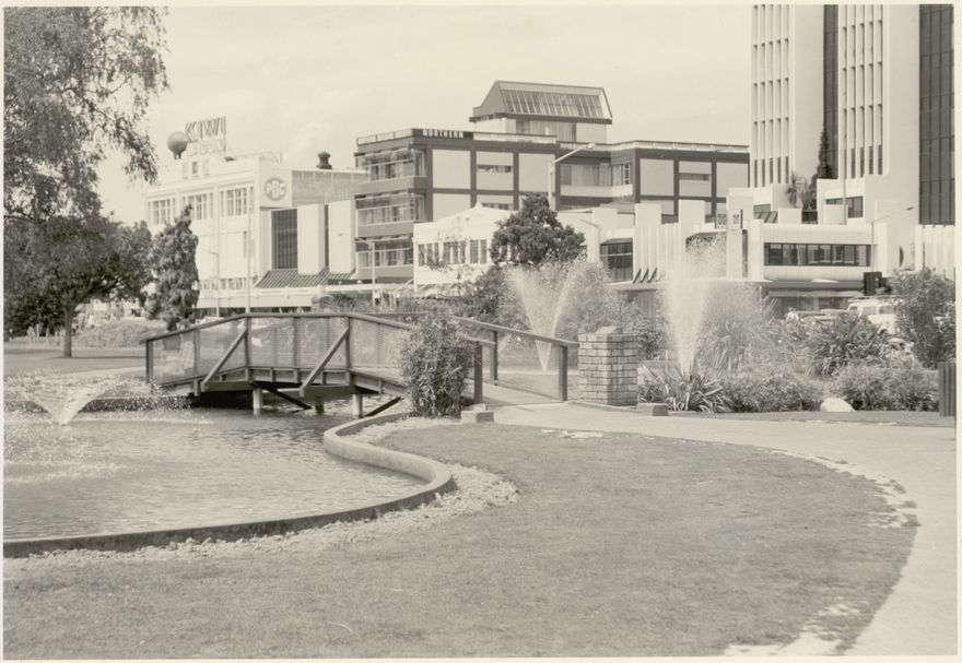 This photograph shows a view of The Lakelet in The Square. The PDC can be seen on the right, topped with the Kiwi Bacon sign and giant kiwi. This image is from a series of framed photographs that were rescued from a local dumpster.