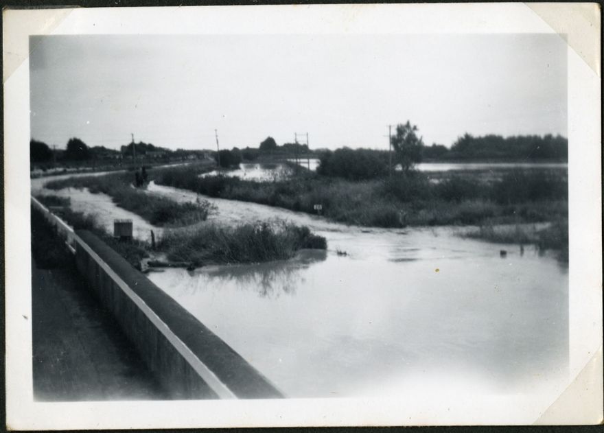 The 1953 flooding of the Manawatu and Oroua Rivers was one of the worst on record for the area. This photograph shows Bourke's Drain during the Rangiotu Flood, taken from the Main Road looking towards Palmerston North.