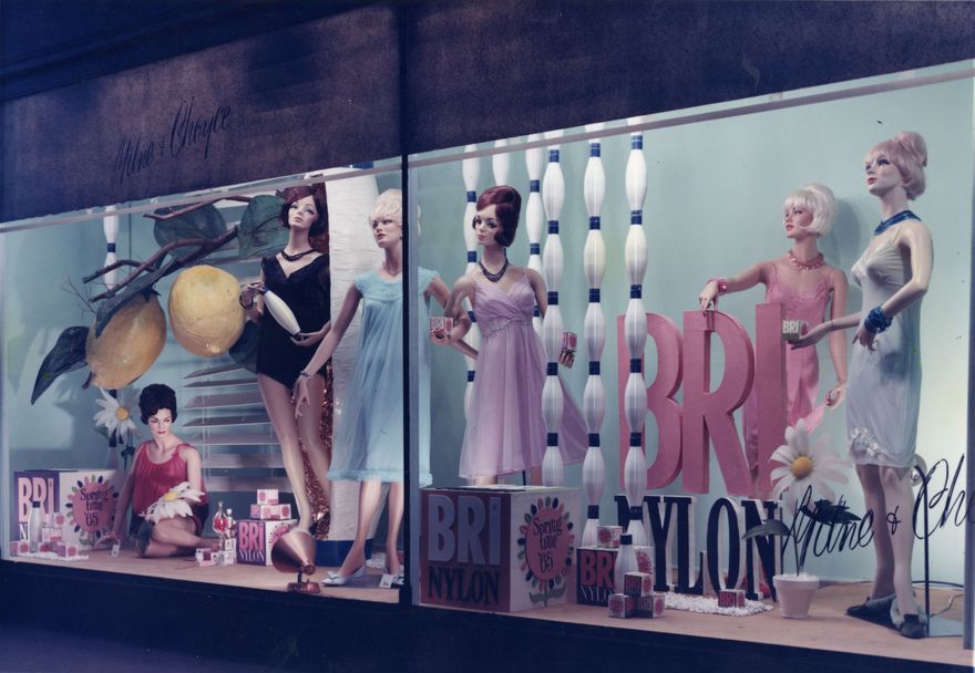A display in the window of Milne & Choyce department store featuring mannequins wearing Bri Nylon underwear and nightwear. Allan Smith designed this display while employed by Milne Choyce. He was first employed by the C M Ross department store in 1959, which was then bought out by Milne and Choyce. He rose to become Display Manager.