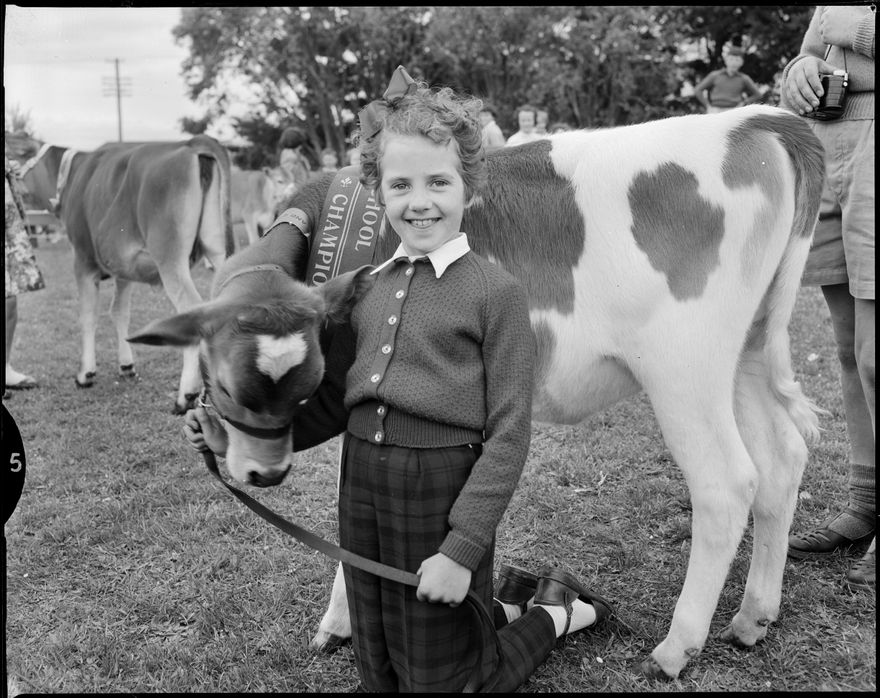 This image was taken for a story that ran in The Manawatu Evening Standard on 19 November 1960 "Carol Richfield proudly poses for the camera with her champion calf at the Tokomaru School yesterday during the calf judging. Carol also won the dairy type section with her calf, Beauty."