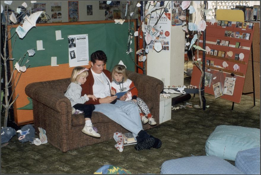 Children being read to in the children's and young people's area of the Palmerston North Public Library. Taken on the occasion of the millionth issue of a library item.