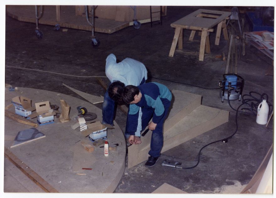 Manawatu Theatre Society Stage Crew members Peter and Rhys Doherty help to construct sets of Little Shop of Horrors.