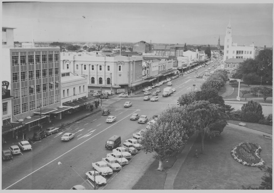 This photograph looks up towards Broadway Avenue. On the left is the MLC building and beside that is the Clarendon building. The building on the corner of Rangitikei Street is the Bank of New Zealand. The Australasian Temperance and General Mutual Life Assurance Society Ltd (T&G) building is on the right (built 1937) and beside that is the Bank of Australasia. Further down Broadway Avenue is St Patrick's Church. For earlier views of Broadway Avenue see 2014n_sq220_008639 and 2014P_Sq28_008836.