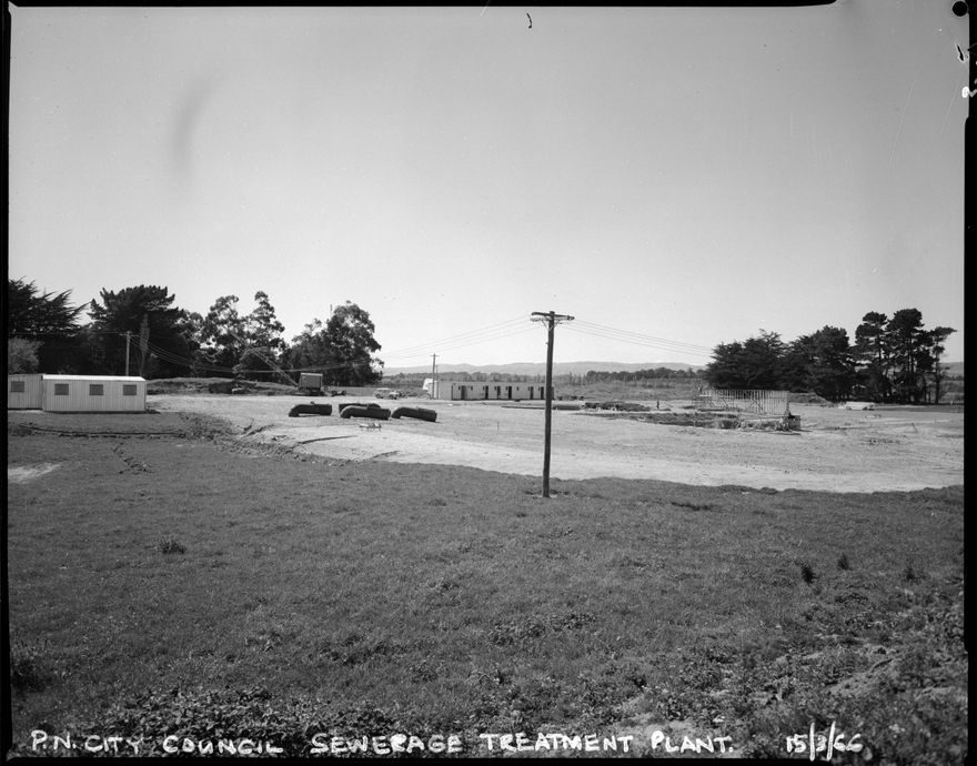 The sewerage treatment plant beside the Manawatu River opened in 1968, replacing the septic tank and filter beds which had been in use since 1905. Some images from this collection have been digitised from prints housed in other archival collections. This image is from an original negative.